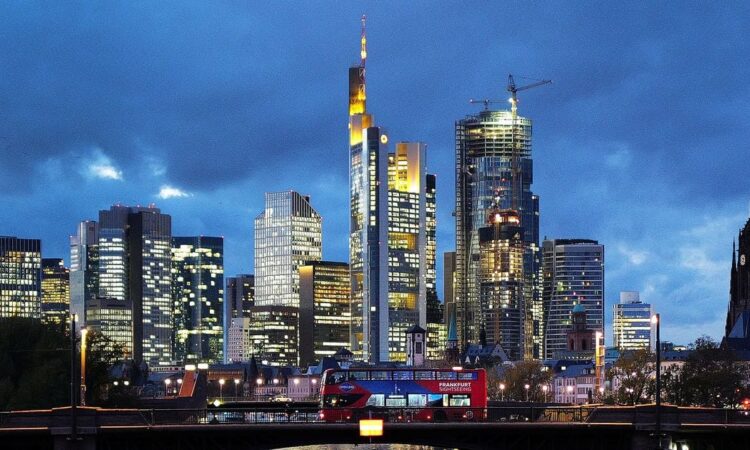 A double decker bus passes the skyline with its dominating banking district in Frankfurt, Germany, November 8, 2023. REUTERS/Kai Pfaffenbach/File Photo Acquire Licensing Rights