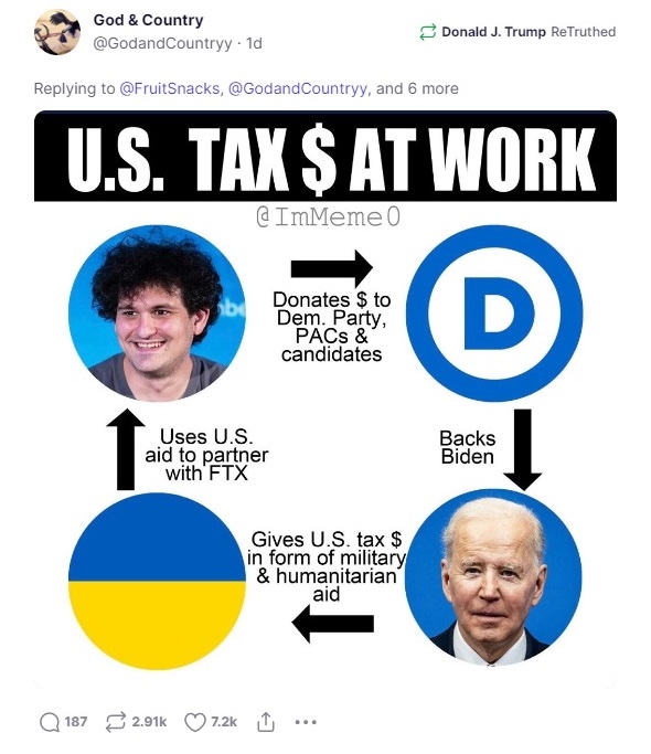 The image Trump promoted is shown at right — it claims that President Joe Biden had given “U.S. tax $” to Ukraine; Ukraine had used that money in a deal with FTX; FTX’s then-CEO had donated it to the Democratic Party and political action committees; and the Democratic Party had backed Biden.
