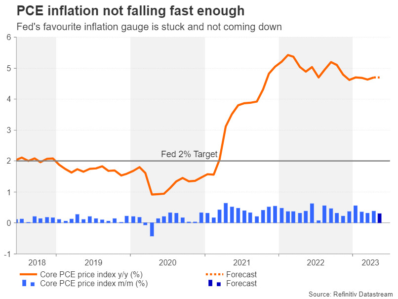 The euro’s advance against the greenback has stalled around the 50% Fibonacci retracement level of the 2021-2022 downtrend as the Eurozone recovery has stumbled and inflationary pressures in the region have started to dissipate, questioning the ECB’s resolve to hike rates a few more times this year. In the US, although inflation has come down considerably, it’s looking increasingly likely that it will need an extra nudge from the Fed to fall further, and the core PCE data may validate that view.