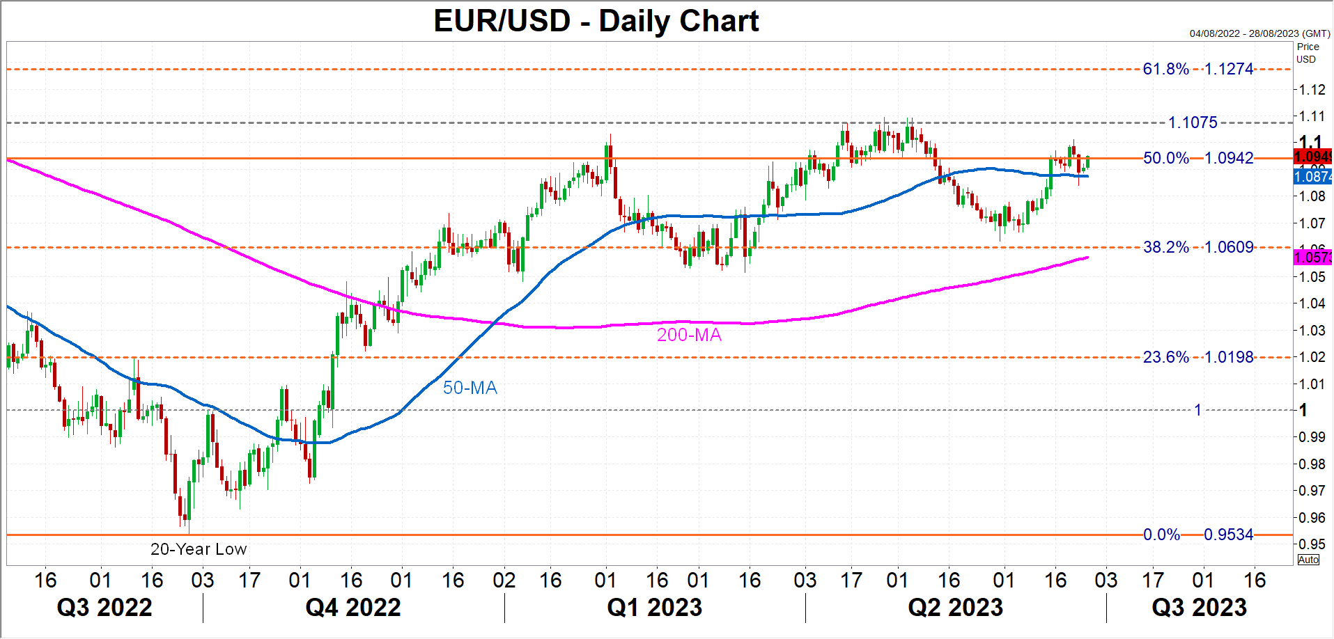 However, if the core PCE price index drops unexpectedly, the euro might manage to clear the 50% Fibonacci of $1.0942, after which, the $1.1075 area will attract interest again after the pair repeatedly failed to conquer it in April and May. A break higher would turn the spotlight on the 61.8% Fibonacci of $1.1274.